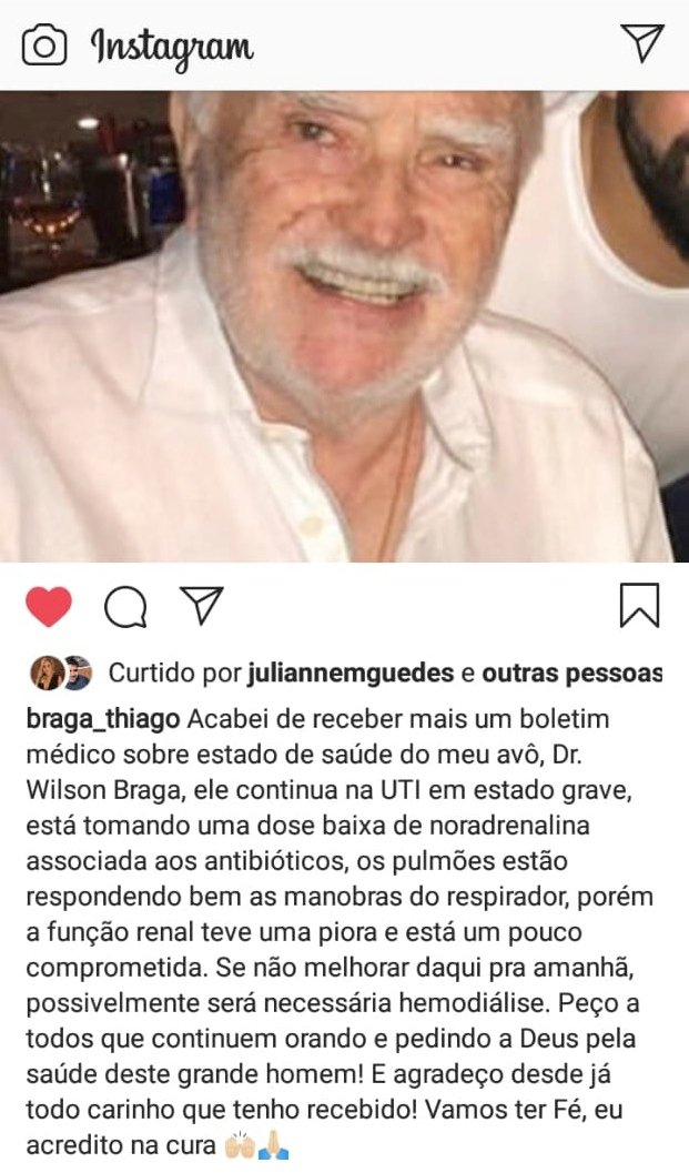 De acordo com o Thiago Braga, o seu avô segue tomando doses de noradrenalida, associadas a antibióticos, e permanece entubado em uma Unidade de Terapia Intensiva (UTI) no Hospital Nossa Senhora das Neves, em João Pessoa.