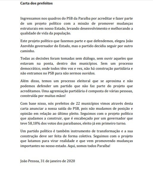 Vinte e dois prefeitos assinaram uma carta onde oficializam uma desfiliação em massa no PSB paraibano e aumentaram a crise no partido em pleno ano eleitoral. Eles alegam falta de diálogo e o processo antidemocrático adotado para mudança da direção estadual. Durante o encontro onde ficou decidida a desfiliação, os prefeitos destacaram que se filiaram a sigla por acreditar em um projeto político que tinha a missão de promover mudanças estruturais na Paraíba, levando desenvolvimento e melhorando a qualidade de vida da população.