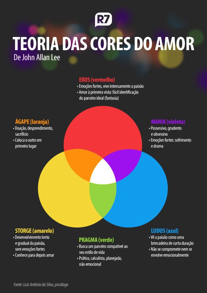 Entre os padrões estão o Eros (vermelho), sujeito à paixão avassaladora, o Ludus (azul), marcado pelo prazer a curto prazo, e o Stroge (amarelo), que busca afeição e companheirismo e precisa da amizade antes de firmar um relacionamento. Além desses, há outros três subtipos.