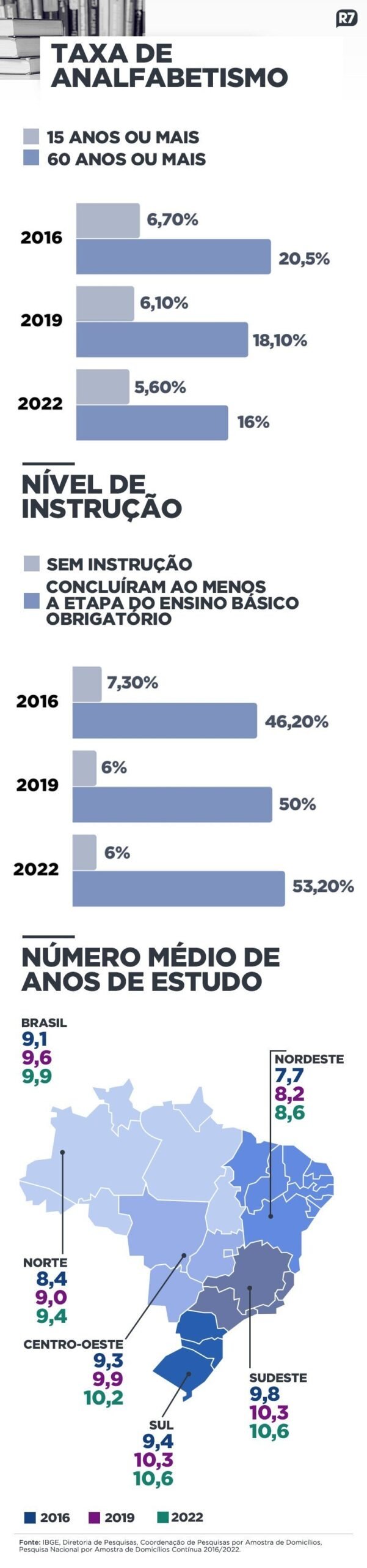 A Pesquisa Nacional por Amostra de Domicílios Contínua (Pnad) divulgada hoje pelo Instituto Brasileiro de Geografia e Estatística (IBGE) mostra que a taxa de analfabetismo de quem tem 15 anos ou mais caiu de 6,7%, em 2016, para 5,6%, em 2022 — o equivalente a 9,6 milhões de pessoas. O índice de quem tem 60 anos ou mais também caiu entre esses anos, de 20,5% para 16%.