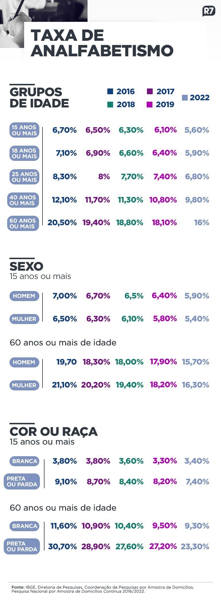 No grupo de 60 anos ou mais, a taxa de analfabetismo das pessoas de cor branca alcançou 9,3% e, entre as pessoas pretas ou pardas, chegou a 23,3%. Nesse último grupo, comparando-se os dados de 2022 com os de 2019, nota-se uma queda de 3,9%.