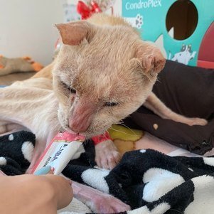 Eliseu foi encontrado desnutrido, desidratado e sem conseguir se mexer. Uma infecção generalizada tomou conta de toda a corrente sanguínea do gato que piorou. O estado de saúde do animal foi crítico. Precisou de oxigênio, tapete térmico e soro glicosado.