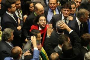 — Eu discursei e o deputado Jean Wyllys não deve ter gostado do que falei. Depois que ele deu o seu voto (contra o impeachment), saiu exaltado porque a votação já estava decidida. Foi nesse momento que me deu uma cusparada no rosto, que atingiu também deputados que estavam atrás de mim. Eu não o segurei, as câmeras vão mostrar isso. Também não o xinguei, vou chutar cachorro morto? — declara Bolsonaro.
