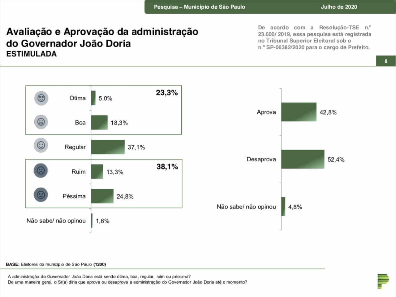 O Paraná Pesquisa ouviu 1,2 mil eleitores paulistanos entre os dias 4 e 8 de julho. O levantamento está registrado no TRE sob nº SP-06382/2020.