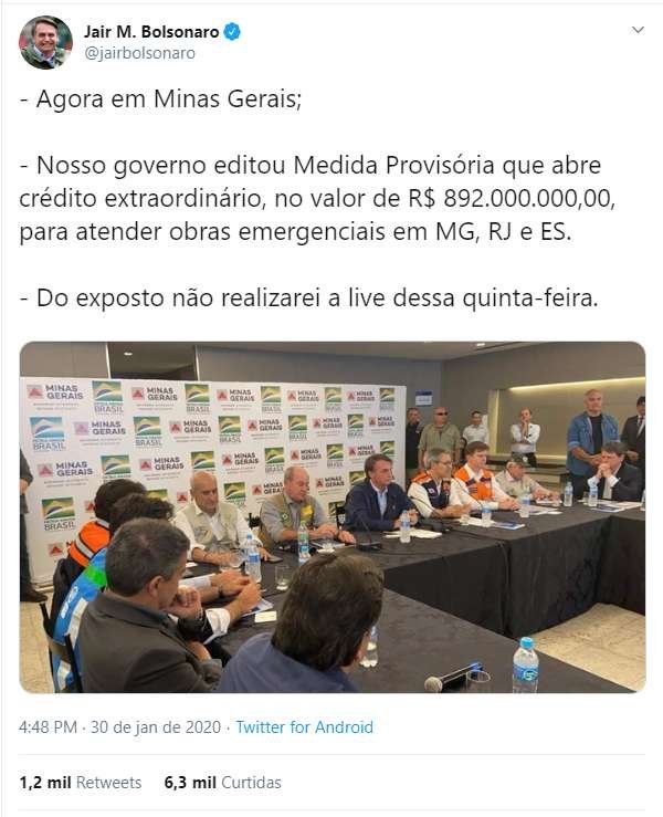 “Nosso governo editou Medida Provisória que abre crédito extraordinário, no valor de R$ 892.000.000,00, para atender obras emergenciais em MG, RJ e ES”, escreveu o presidente.