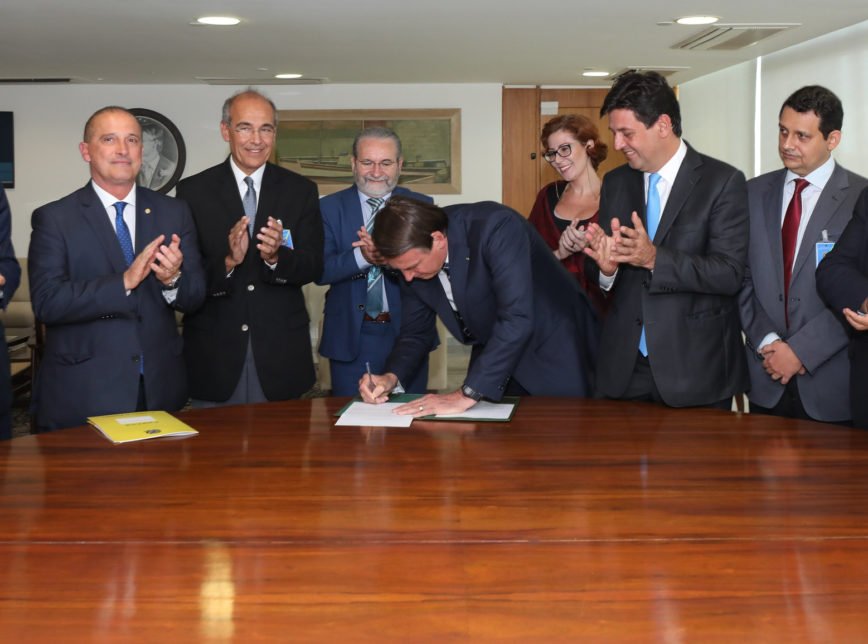 O presidente Jair Bolsonaro sancionou na tarde desta 4ª feira (18.dez.2019), junto ao ministro Henrique Mandetta (Saúde), a lei que dispõe sobre a criação do programa Médicos pelo Brasil. O texto é de autoria do Poder Executivo e foi enviado pela MP (Medida Provisória) nº 890 ao Congresso, que a aprovou no último dia 27.