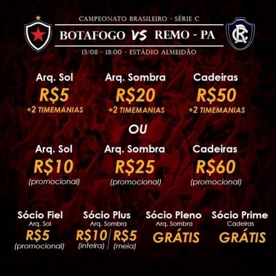 A diretoria do Botafogo inicia nesta quarta-feira (9) a venda de ingressos para o confronto diante do Remo, pela Série C do Campeonato Brasileiro. A partida acontece no próximo sábado (13) às 18h no Estádio Almeidão.