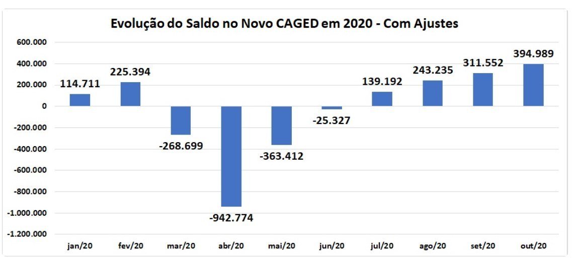 O ministro da Economia, Paulo Guedes, afirmou que o resultado de outubro foi o melhor da série histórica do Caged, iniciada em 1992. “Esse mês de outubro foi o mês em que geramos mais empregos na série histórica do Caged. Desde 1992, o Brasil não criava tantos empregos em um mês. Tivemos quase 400 mil empregos, 394 mil empregos. Então, a economia brasileira continua retomando em V, em um ritmo acelerado”, disse Guedes.