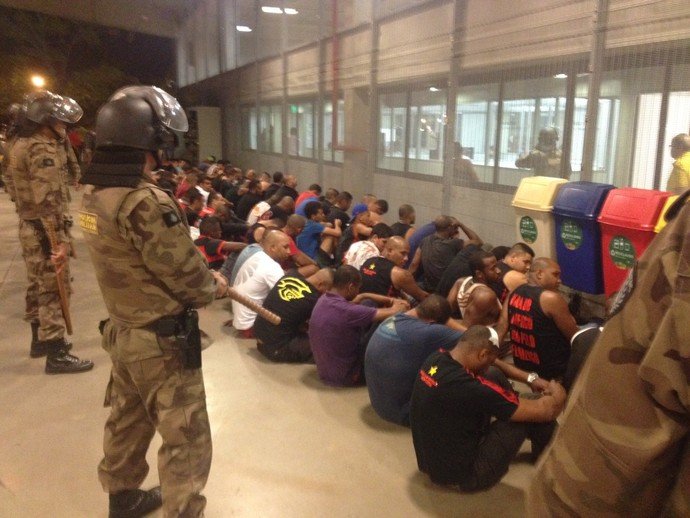 Briga entre torcidas de Atlético-MG e Flamengo após a goleada do Galo por 4 a 1, ocorrida no lado de fora do Mineirão, terminou com prisão de 87 torcedores. Maioria dos detidos são integrantes cariocas da Torcida Jovem, com participação também de membros da Pavilhão Independente, do Cruzeiro. De acordo com a PM, as duas torcidas estão proibidas de frequentar estádios de futebol e muitos dos cariocas deveriam informar autoridades que estariam em deslocamento.