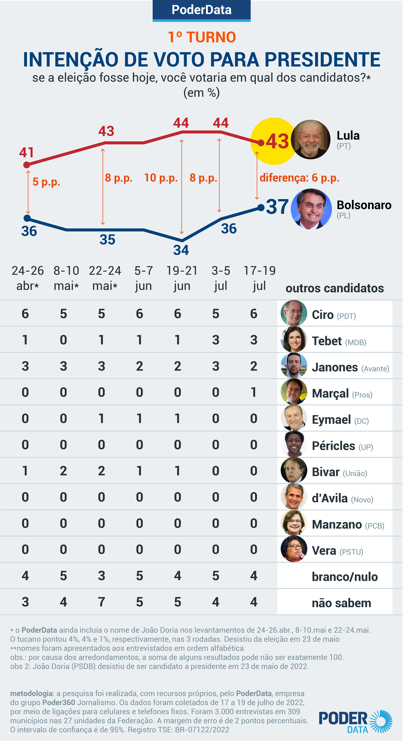 A suposta vantagem do ex-presidiário e ex-presidente Luiz Inácio Lula da Silva (PT) sobre o presidente Jair Bolsonaro (PL) na corrida pelo Planalto está em 6 pontos percentuais. O petista teria 43% contra 37% do na simulação de 1º turno, segundo pesquisa PoderData realizada de 17 a 19 de julho. Essa diferença de 6 pontos é a menor registrada entre Lula e Bolsonaro desde abril de 2022, quando começaram a ser sentidos de maneira mais vigorosa os efeitos da alta da taxa de inflação e dos preços dos combustíveis. Ainda faltam 74 dias para a eleição de 2 de outubro…