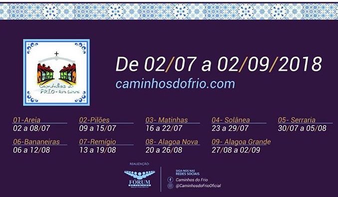Foi divulgado o calendário oficial do Caminhos do Frio de 2018. A programação começa pela cidade de Areia no dia 2 de julho e passa por mais oito cidades do Brejo até chegar a Alagoa Grande, onde a rota cultural se encerra no dia 2 de setembro.