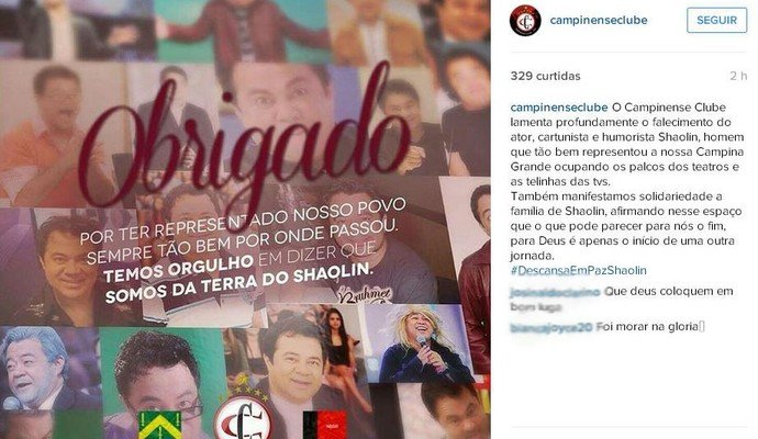 – O Campinense Clube lamenta profundamente o falecimento do ator, cartunista e humorista Shaolin, homem que tão bem representou a nossa Campina Grande, ocupando os palcos dos teatros e as telinhas das tvs. Também manifestamos solidariedade a família de Shaolin, afirmando nesse espaço que o que pode parecer para nós o fim, para Deus é apenas o início de uma outra jornada – escreveu o Campinense Clube.