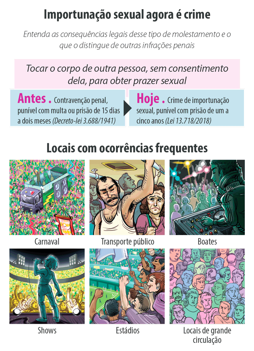 Até seis meses atrás, esses atos mais ou menos furtivos eram punidos basicamente com multas — de R$ 318 a R$ 47,7 mil — e, no máximo, curtos períodos de prisão. Levando em conta a legislação, os juízes entendiam que se tratava de importunação ofensiva ao pudor ou molestamento, contravenções penais previstas nos artigos 61 e 65 do Decreto-Lei 3.688, de 1941. A contravenção é uma falta considerada mais leve que o crime. Pode ser punida de forma pecuniária e ou com prisão simples (regime aberto ou semiaberto). O crime requer a pena de reclusão (regime inicial fechado) ou detenção (regime inicial semiaberto), dependendo da gravidade.