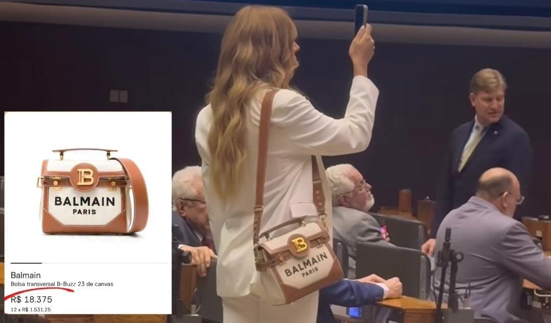 A bolsa em questão é da grife francesa Balmain, modelo transversal B-Buzz 23 de canvas; avaliada em R$ 18.375,00.