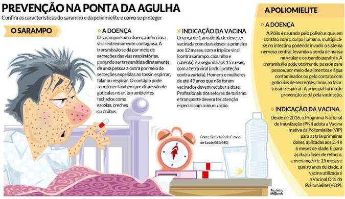 A Organização Mundial da Saúde (OMS) recomendou que todas as pessoas que forem viajar para a Copa do Mundo 2018 estejam com todas as vacinas em dia, incluindo aquela que protege contra sarampo, rubéola e caxumba – chamada no Brasil de tríplice viral. Isso porque se estima que a Copa do Mundo, no seu decorrer, atrairá cerca de 1 milhão de pessoas de todo o mundo. Dos 32 países que participam do torneio, 28 registraram este ano casos de sarampo – doença altamente contagiosa (veja quadro) e que pode ter graves sequelas ou até levar à morte. Só na Rússia, foram notificados mais de 600 casos. A intensificação das viagens internacionais e o movimento de pessoas durante o grande evento aumentam o risco de transmissão dessa e de outras doenças. No ano passado, a meta de imunização em Minas não foi cumprida e neste ano, por enquanto, também não. Outra doença com prevenção abaixo da meta é a poliomielite.