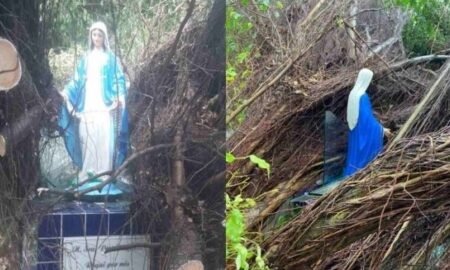 Uma árvore que localizada no estacionamento em frente Maternidade Cândida Vargas caiu, nesta quarta-feira (22) e uma imagem de Nossa Senhora das Graças que fica no local está...