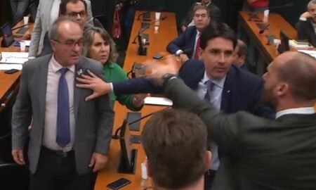 O deputado Eduardo Bolsonaro (PL-SP) perdeu o controle e correu na direção do colega Marcon (PT-RS) hoje na Câmara após o petista...