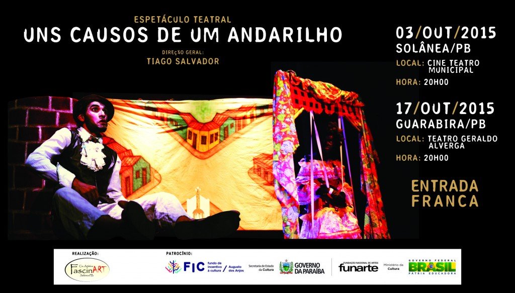 A Cia. Artística Fascinart, estará em cartaz neste sábado, dia 03 de outubro, no Cine Teatro Municipal de Solânea com o seu espetáculo de teatro “Uns Causos de um Andarilho”. A apresentação terá entrada franca e conta com o patrocino do FIC – Fundo de Incentivo à Cultura do Governo de Estado da Paraíba e do Ministério da Cultura do Brasil.