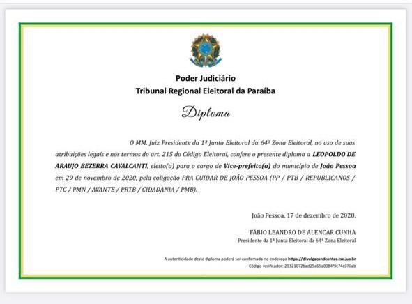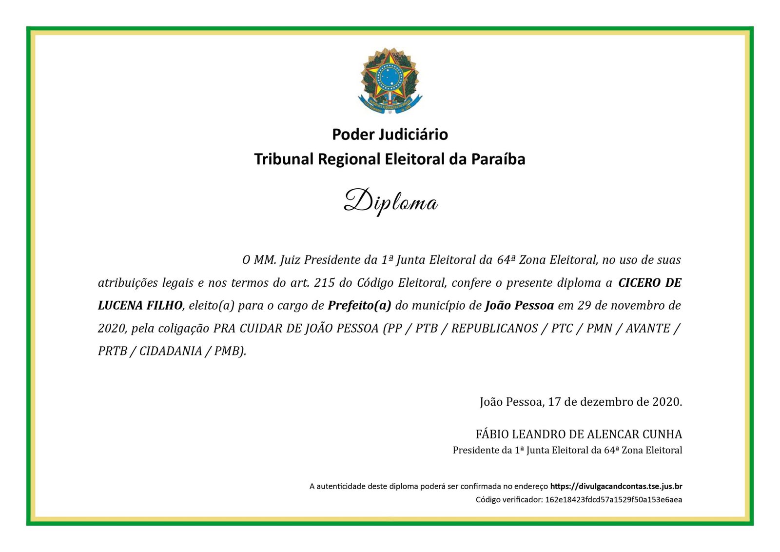 O Tribunal Regional Eleitoral da Paraíba (TRE-PB) emitiu, nesta quinta-feira (17), os diplomas digitais do prefeito eleito de João Pessoa, Cícero Lucena (Progressistas) e de seu vice, Leo Bezerra (Cidadania).