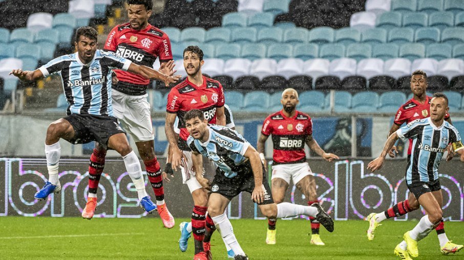 O primeiro tempo foi definido pela disciplina tática do Grêmio e pelas falhas do Flamengo na defesa. Luiz Felipe Scolari montou um meio-campo com três volantes e Douglas Costa como armador. E conseguiu anular Everton Ribeiro e o discretíssimo Arrascaeta, neutralizando quase completamente o ataque rubro-negro.