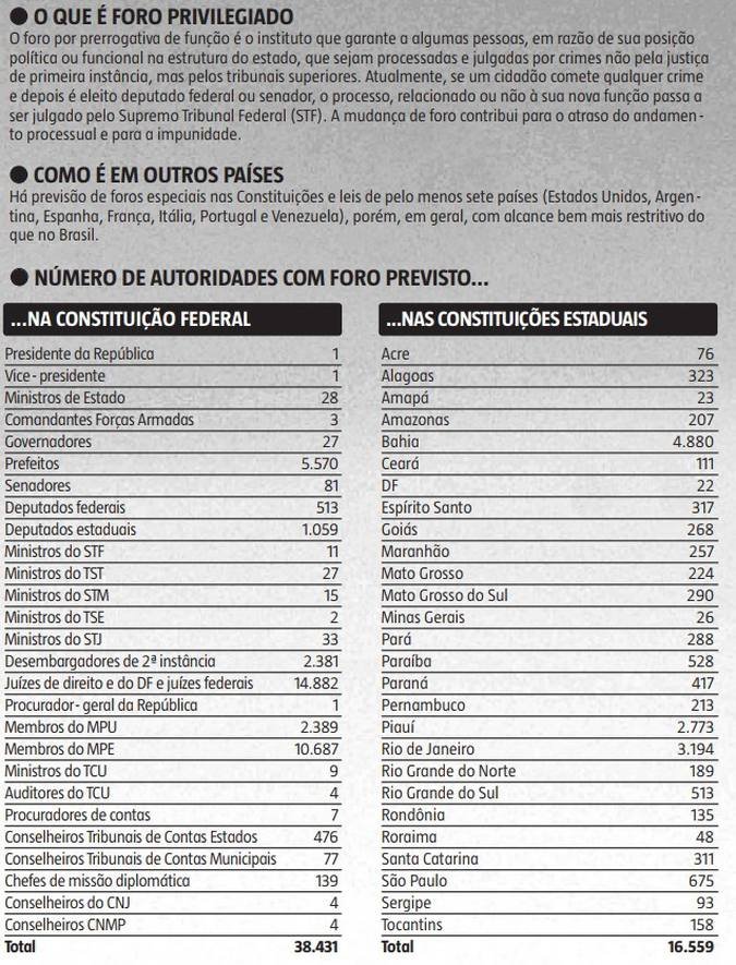 Mais uma vez cairá sobre o colo do Supremo Tribunal Federal (STF) decidir um importante tema da competência do Congresso Nacional: a revisão do foro por prerrogativa de função, o chamado foro privilegiado, que atualmente beneficia não apenas agentes políticos, mas aproximadamente 55 mil autoridades no Brasil (veja quadro), como agentes políticos, ministros de estado e de tribunais superiores, juízes, membros do Ministério Público, governadores, entre outros.