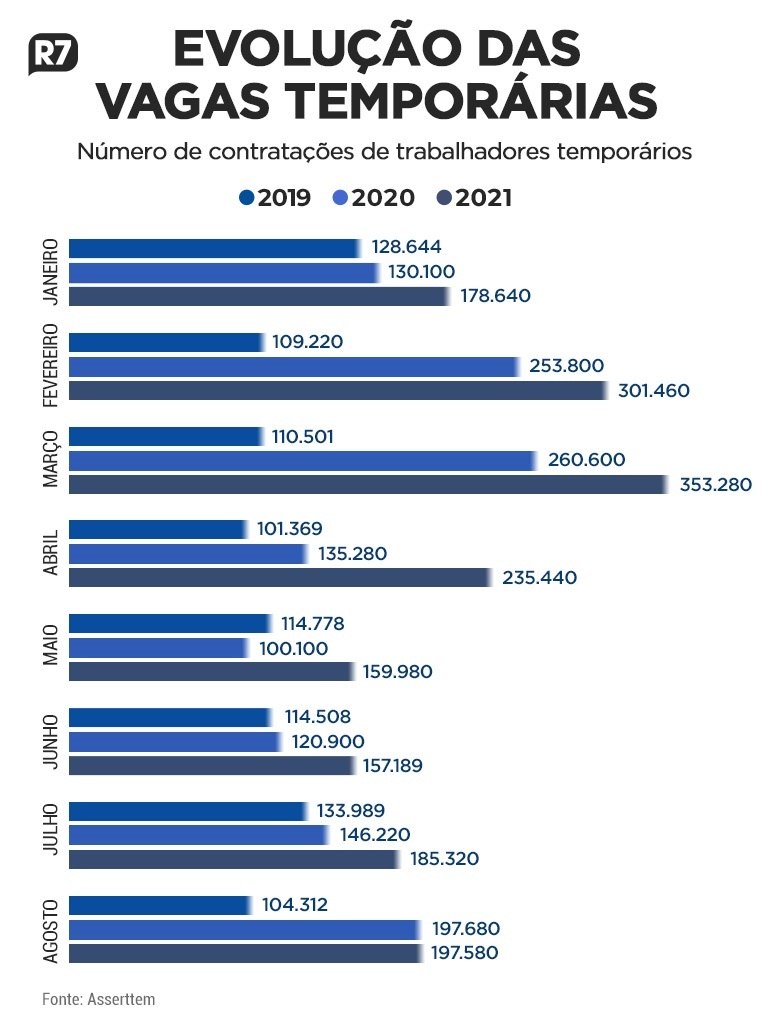 O número de contratações de trabalhadores temporários no Brasil aumentou 31,5% neste ano e já supera os níveis pré-pandemia. De janeiro a agosto, foram registradas 1.768.889 admissões, frente a 1.344.680 no mesmo período do ano passado.