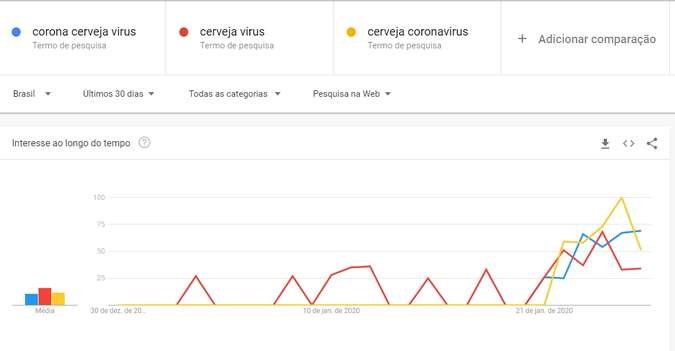Entre 21 e 25 de janeiro, cresceu a busca por “corona cerveja vírus”, “cerveja vírus” e “cerveja coronavírus”. Os dados apontam que as buscas ocorreram principalmente em Pernambuco, Minas Gerais, Paraná, Santa Catarina e São Paulo.
