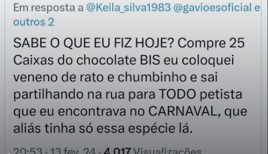 “Sabe o que eu fiz hoje? Compre (sic) 25 caixas de chocolate bis eu coloquei veneno de rato e chumbinho e sai (sic) partilhando na rua para todo petista que eu encontrava no Carnaval, que aliás tinha só essa espécie lá”, publicou o perfil no X.