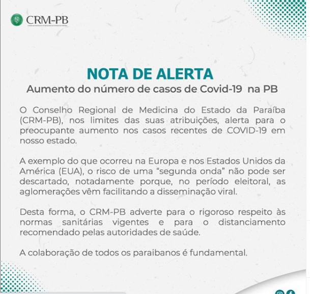 O Conselho Regional de Medicina do Estado da Paraíba (CRM-PB) emitiu uma nota nesta quinta-feira (12) alertando para o risco de uma segunda onda da Covid-19 na Paraíba.