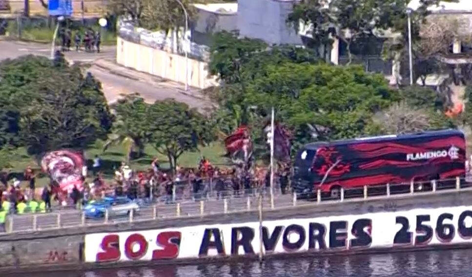 Pertinho, pertinho, pertinho de embarcar. Olha a quantidade de torcedores acompanhando. Com festa da torcida, time do Flamengo chega ao Galeão para embarcar rumo ao Intercontinentalpor Rio de Janeiro