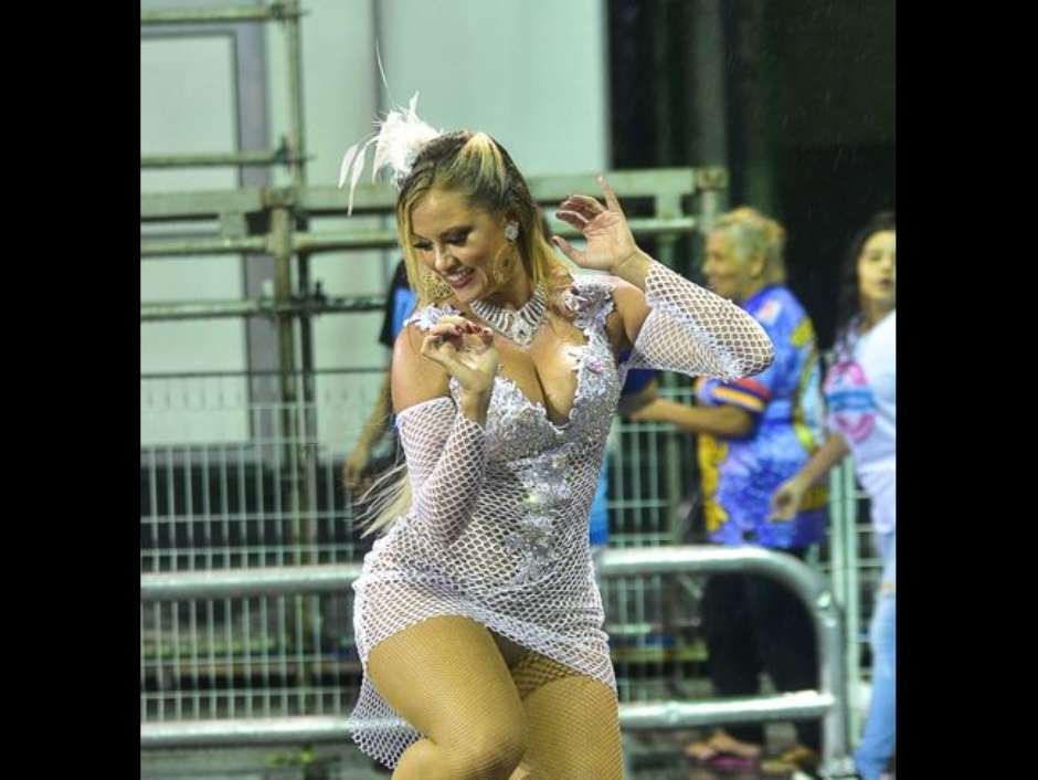Ellen Rocche encarou a chuva durante ensaio técnico da Rosas de Ouro na noite deste sábado (16), no sambódromo do Anhembi, em São Paulo. Ao contrário de Lívia Andrade, que usou um guarda-chuva para driblar a água, a atriz não recorreu a nenhuma proteção para mostrar muito samba no pé.