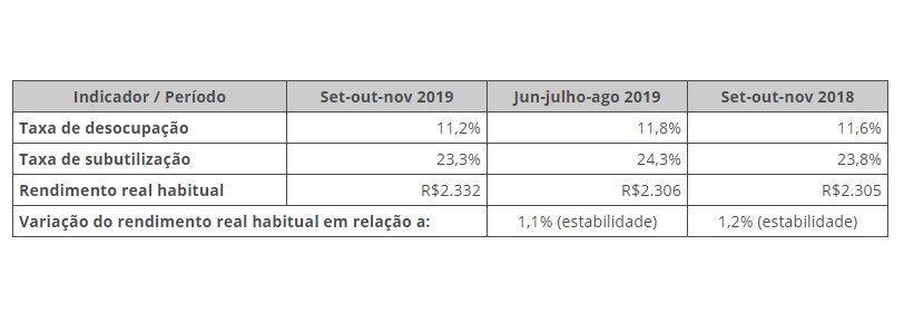 A taxa de desemprego do trimestre encerrado em novembro – setembro, outubro e novembro – deste ano registrou uma queda de 0,7 ponto percentual em comparação com o período de junho a agosto deste ano. Agora, os desocupados são 11,2% da população economicamente ativa, o que representa um total de 11,9 milhões de brasileiros.