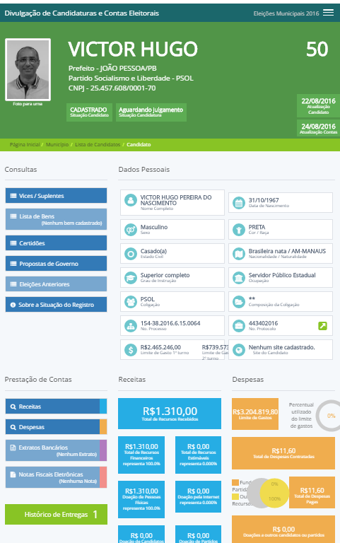O candidato do PSOL, Victor Hugo já gastou o equivalente a R$ 11,60 nesta eleição e declarou ter recebido R$ 1.310.