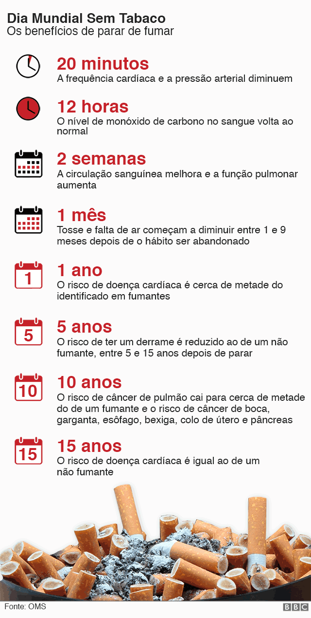 – 10 anos: o risco de câncer de pulmão cai para a metade do risco de um fumante, e o risco de câncer de boca, garganta, esôfago, bexiga, colo de útero e pâncreas