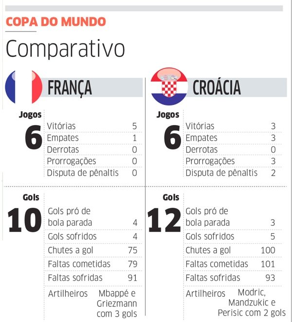Mesmo nível Do lado croata, as atenções serão voltadas para os laterais Vrsaljko e Strinic, que foram os responsáveis pelas jogadas nas pontas que levaram aos gols contra a Inglaterra. O zagueiro Lovren, apontado como um dos melhores defensores do Mundial. Ele foi a segurança da defesa croata no segundo tempo e na prorrogação. Destaque também para os meias Modric, candidato a ser o melhor do mundial e Perisic, o melhor jogador em campo nos dois últimos jogos da equipe na Copa da Russia.