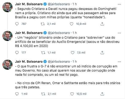Em suas redes sociais, Bolsonaro fez uma análise pontual do depoimento de Cristiano Carvalho, o suposto representante da empresa Davati Medical Supply que teria tentado negociar, ilegalmente, vacinas com servidores do ministério da Saúde.