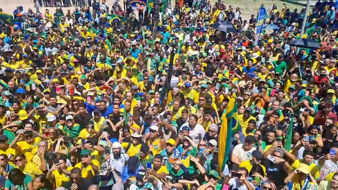 Bolsonaro estava ladeado por Anderson Ferreira, André Ferreira, Gilson Machado e o pastor Silas Malafaia. Também estavam na comitiva do presidente Marcos Feliciano e Magno Malta.