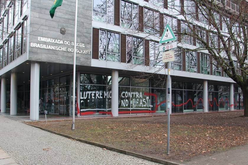 A embaixada do Brasil em Berlim foi alvo de protesto. A fachada do prédio acordou neste sábado, 5, pichada. Em fotos que circulam pelas redes sociais e entre diplomatas brasileiros pelo exterior, pode-se ler nos vidros da entrada do prédio a frase “Lutaremos contra o fascismo no Brasil”.