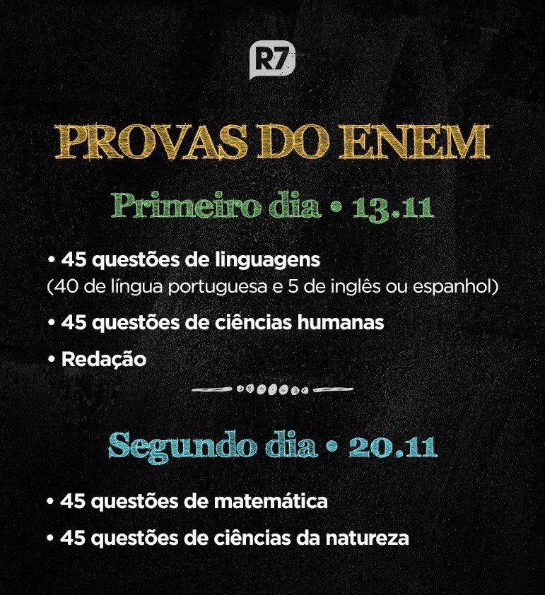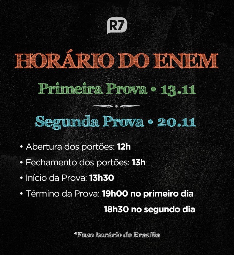 A aplicação da prova terá início às 13h30 e término às 18h30. O R7, em parceria com o Kuadro, fará a transmissão dos comentários do segundo dia de prova a partir das 18h e divulgará o gabarito extraoficial. Conforme o edital, o gabarito oficial deve ser divulgado na próxima quarta-feira, dia 23.