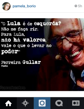 No dia em que o PT da Paraíba consolida apoio à reeleição do governador Ricardo Coutinho, a primeira-dama Pâmela Bório publicou mensagem criticando o ex-presidente petista, Luiz Inácio Lula da Silva. Pâmela publicou a seguinte legenda na foto: “Para rir e também para refletir nesta opinião que coincide com a de Ronald Reagan: Eu achava que a política era a segunda profissão mais antiga. Hoje vejo que ela se parece muito com a primeira”, publicou Pâmela Bório no Instagram.