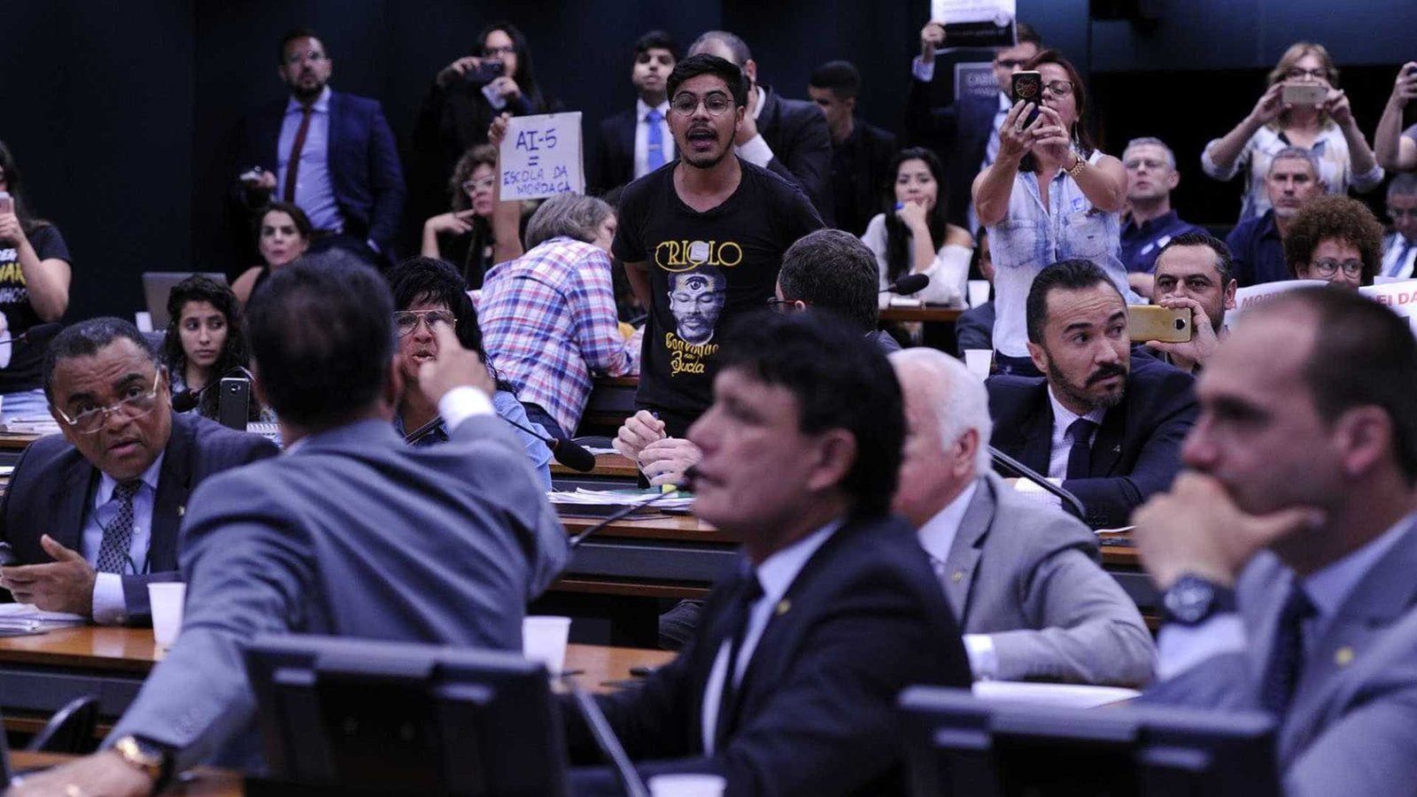 Como em todas as tentativas anteriores, apoiadores e contrários à medida acompanharam a sessão e bateram boca em vários momentos. Um dos cartazes dos apoiadores do Escola sem Partido trazia os dizeres: “Exame toxicológico para professores da rede pública.” Outro, contrário, a inscrição “Lei da mordaça, não!”