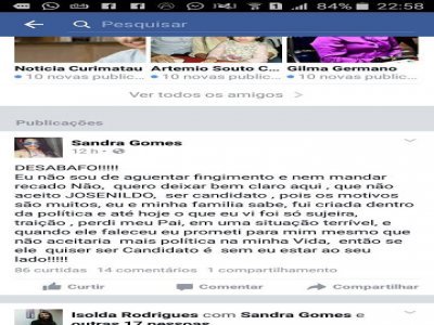 “DESABAFO : Eu não sou de aguentar fingimento e nem mandar recado não , quero deixar bem claro aqui , que não aceito JOSENILDO , ser candidato, pois os motivos são muitos , eu e minha família sabe , fui criada dentro da política e até hoje o que vi foi sujeira , traição , perdi meu Pai, em uma situação terrível, e quando ele faleceu eu prometi para mim mesmo que não aceitaria mais política na minha vida , então se ele quiser ser Candidato é sem eu estar ao seu lado !!!!” postou .