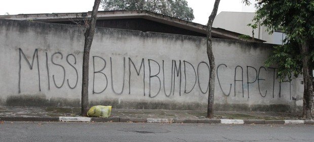 Rebeka Francis, a candidata de Rondônia ao título de Miss Bumbum 2014, vem sofrendo com uma pichação ofensiva no muro do prédio onde mora, em São Paulo. Recentemente, a moça – que divide apartamento com a amiga Andressa Urach (vice miss bumbum 2012) – se deparou com a frase ‘Miss Bumbum do Capeta’ em letras garrafais na entrada do prédio.