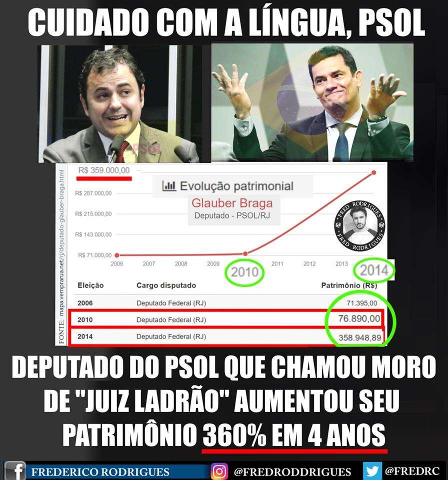 Pobre Sérgio Moro, não só teve que abrir mão de sua vida pessoal, sua privacidade e sua segurança quando decidiu enfrentar os grupos políticos mais poderosos do Brasil, como também é obrigado a aguentar pessoas do nível de Glauber Braga do Psol (partido que dispensa apresentações) lhe chamando de “corrupto” e “ladrão”.