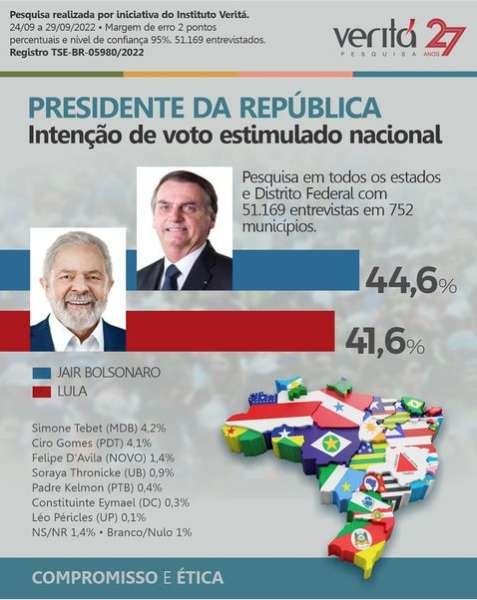 Publicada no início da madrugada deste sábado (1), a pesquisa nacional do Instituto Veritá mostrou um crescimento de Jair Bolsonaro na preferência do eleitorado na disputa presidencial, com 44,6% das intenções de voto na pergunta estimulada (com a indicação do nome de todos os concorrentes). Em segundo, permanece o ex-presidiário Lula, com 41,6%, uma queda em relação ao levantamento anterior.