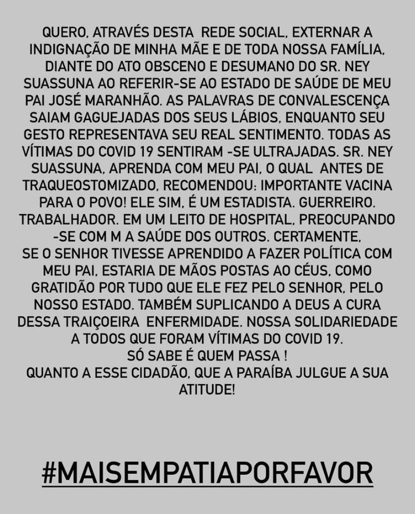 Na nota, assinada por Alice, os familiares de José Maranhão classificam o ato de Suassuna como “obsceno e desumano”.