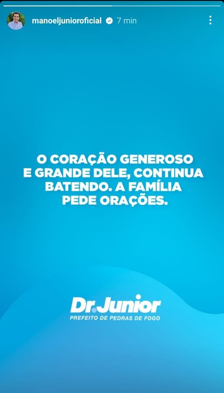Após grupos em WhatsApp e sites de notícias compartilharem a notícia falsa de que o prefeito de Pedras de Fogo, Manoel Júnior teria falecido, a família pediu orações para o gestor, que segue vivo e internado em estado grave no Hospital Nossa Senhora as Neves, em João Pessoa.