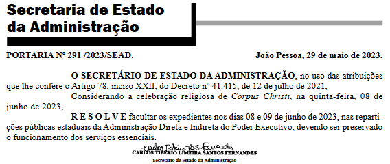 Foi publicada na edição desta terça-feira (30) do Diário Oficial do Estado (DOE) portaria que faculta o expediente nos órgãos da administração direta e indireta do Governo da Paraíba nos dias 08 e 09 de junho, em razão da celebração religiosa de Corpus Christi. A portaria nº 291 é assinada pelo secretário de administração do estado, Tibério Limeira.