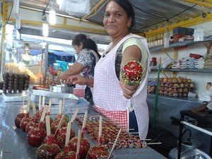 Entre os comerciantes que instalaram suas barracas na avenida Visconde de Pelotas para a festa deste ano está Maria de Jesus, que há 20 anos vende maçã do amor no evento que celebra o aniversário da capital paraibana, que completa 430 anos na quarta-feira (5). “É disso que eu sobrevivo”, garante, contando que aprendeu o ofício com o marido, que aprendeu com a mãe, antiga vendedora do quitute na festa. “Meus filhos já estão pegando o serviço pra quando eu me aposentar”, diz.
