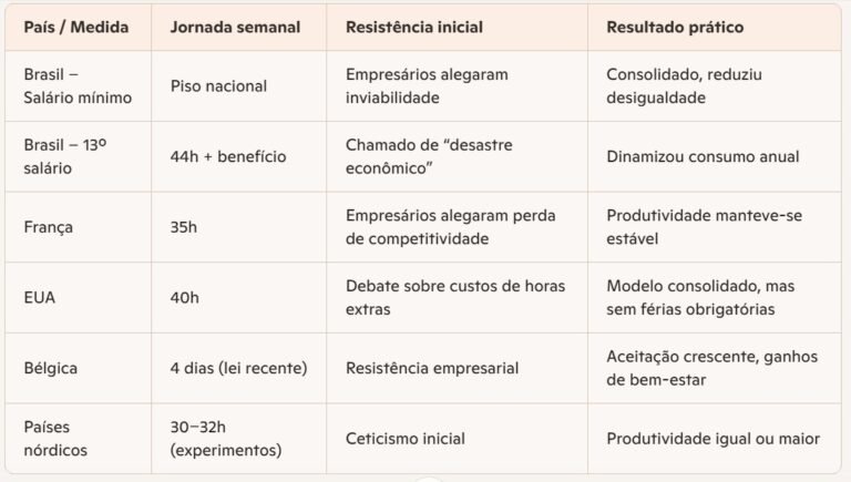 O Chile aprovou a redução gradual da jornada de 45 para 40 horas semanais até 2029, enquanto a Colômbia está em transição de 48 para 42 horas até 2026. Na Europa, a jornada de 40 horas ou menos é predominante: a França adota 35 horas semanais desde os anos 2000, e países como Alemanha e Holanda operam, na prática, com médias inferiores a 40 horas.
